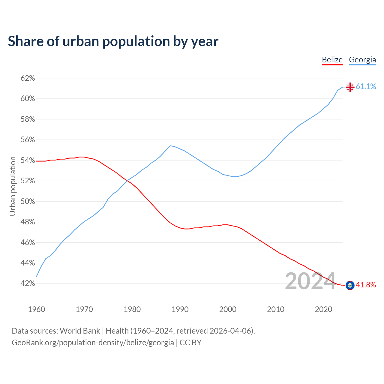 From 2004 to 2024, the share of urban population changed from 47% to 41.8% in Belize and from 52.7% to 61.1% in Georgia.