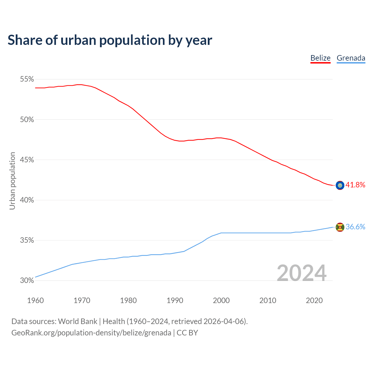 From 2004 to 2024, the share of urban population changed from 47% to 41.8% in Belize and from 35.9% to 36.6% in Grenada.