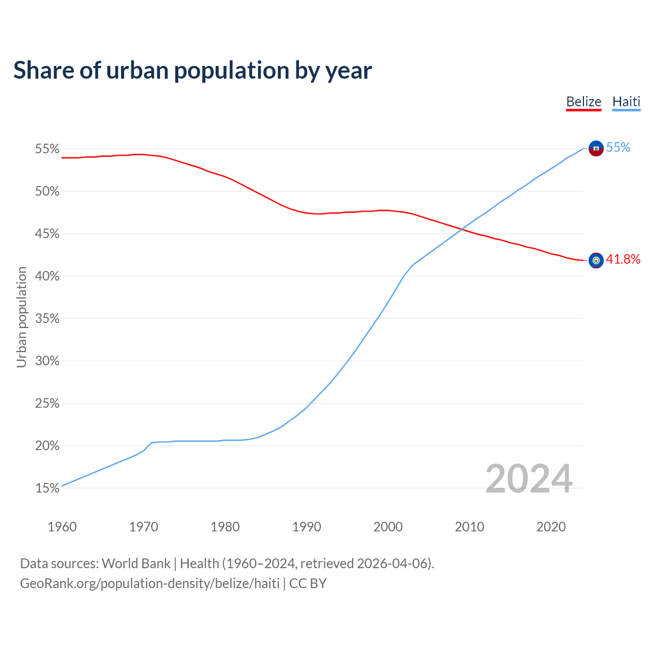 From 2004 to 2024, the share of urban population changed from 47% to 41.8% in Belize and from 41.9% to 55% in Haiti.