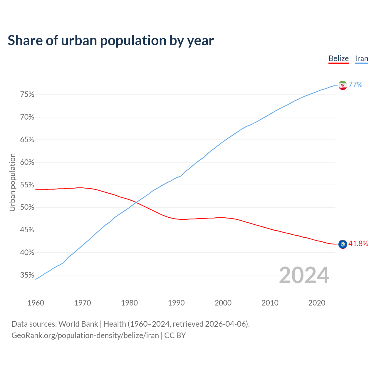 From 2004 to 2024, the share of urban population changed from 47% to 41.8% in Belize and from 67.3% to 77% in Iran.