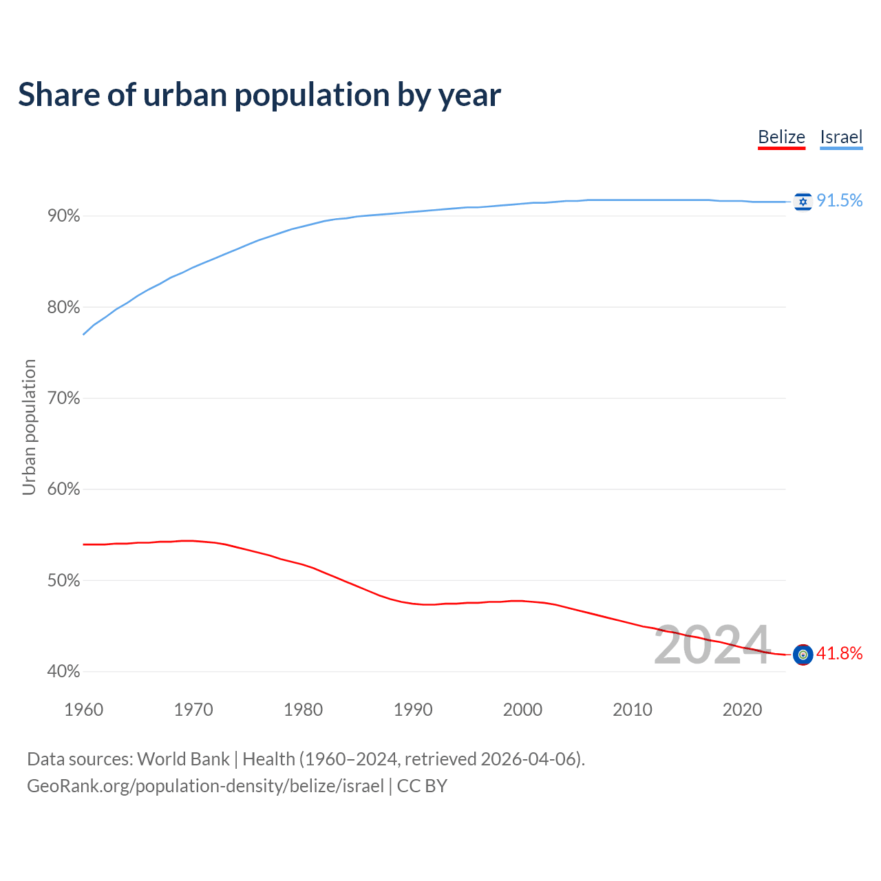 From 2004 to 2024, the share of urban population changed from 47% to 41.8% in Belize and from 91.6% to 91.5% in Israel.