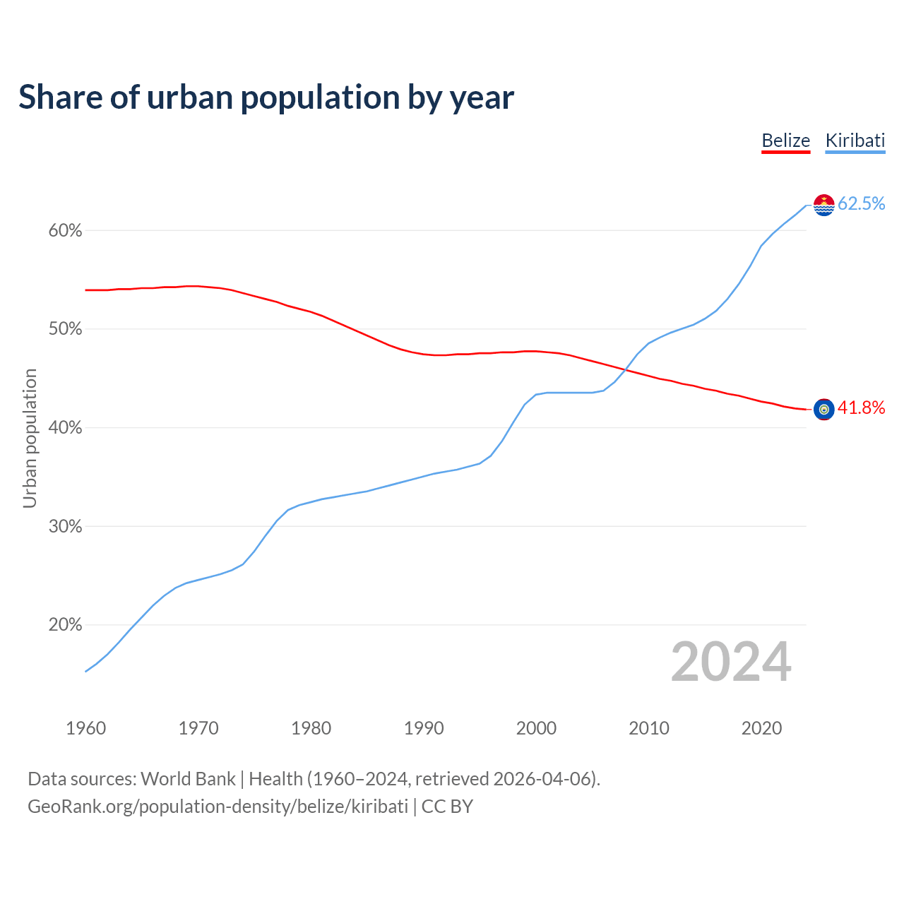 From 2004 to 2024, the share of urban population changed from 47% to 41.8% in Belize and from 43.5% to 62.5% in Kiribati.