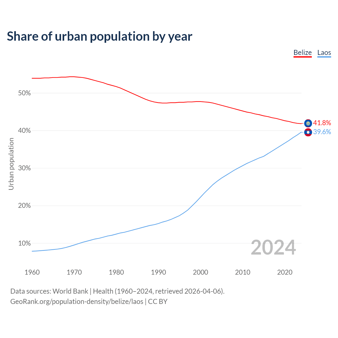 From 2004 to 2024, the share of urban population changed from 47% to 41.8% in Belize and from 26.5% to 39.6% in Laos.