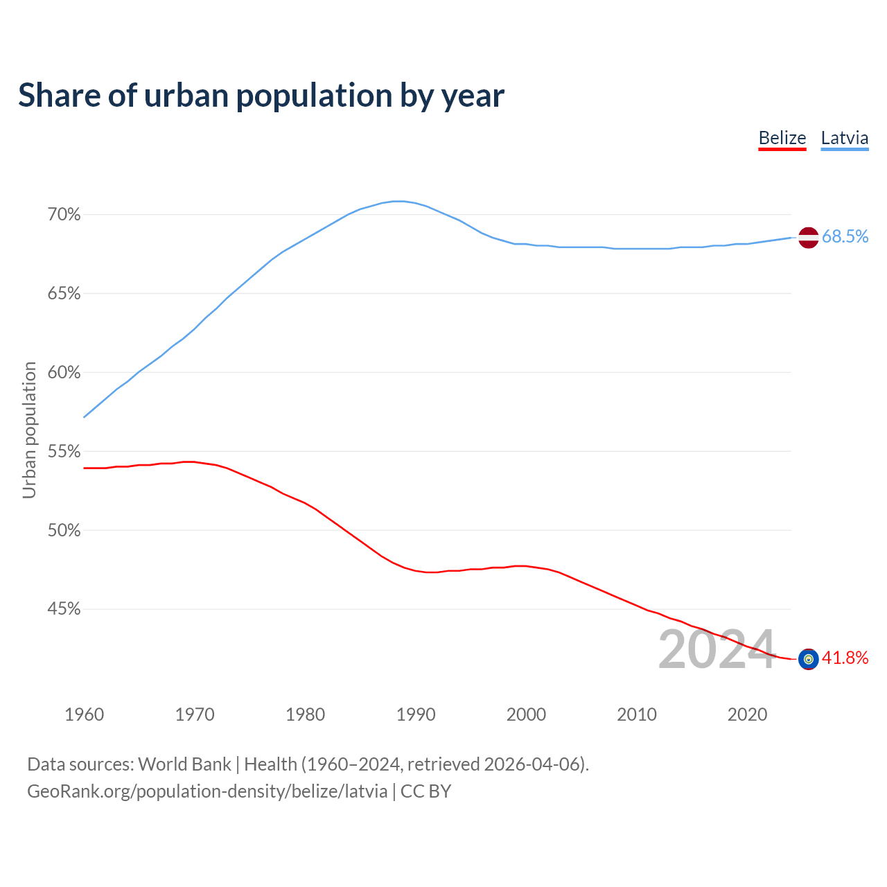 From 2004 to 2024, the share of urban population changed from 47% to 41.8% in Belize and from 67.9% to 68.5% in Latvia.