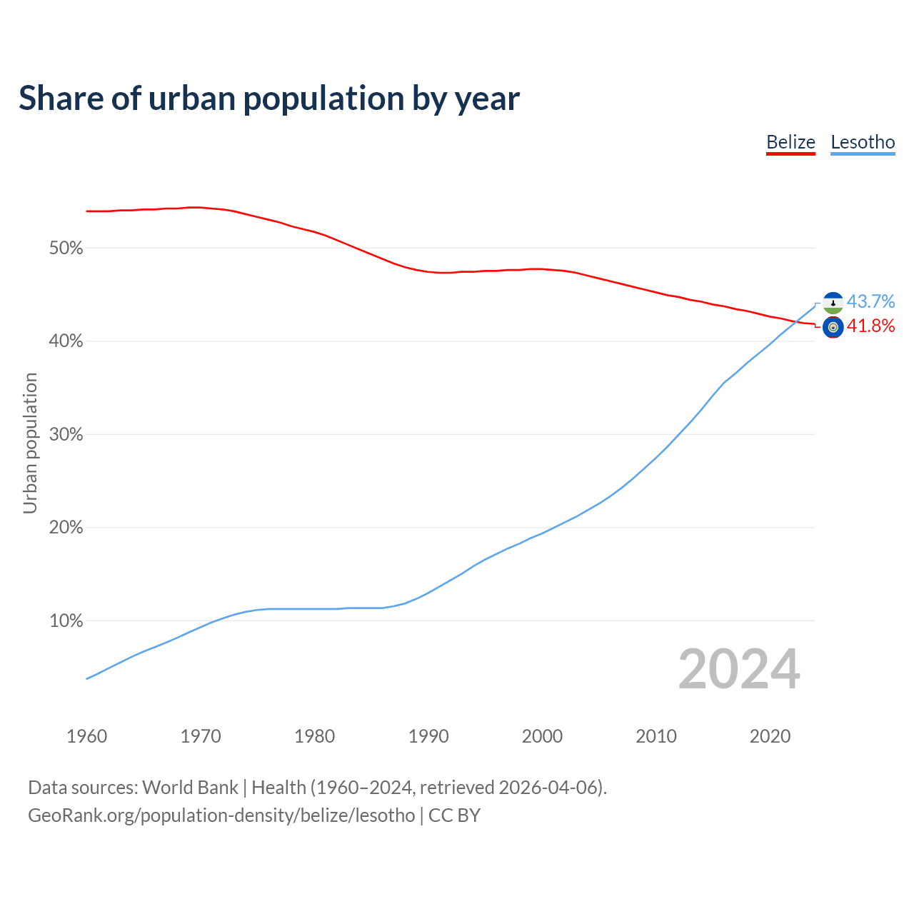From 2004 to 2024, the share of urban population changed from 47% to 41.8% in Belize and from 21.8% to 43.7% in Lesotho.