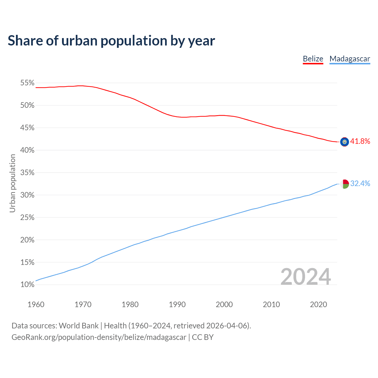 From 2004 to 2024, the share of urban population changed from 47% to 41.8% in Belize and from 26.2% to 32.4% in Madagascar.