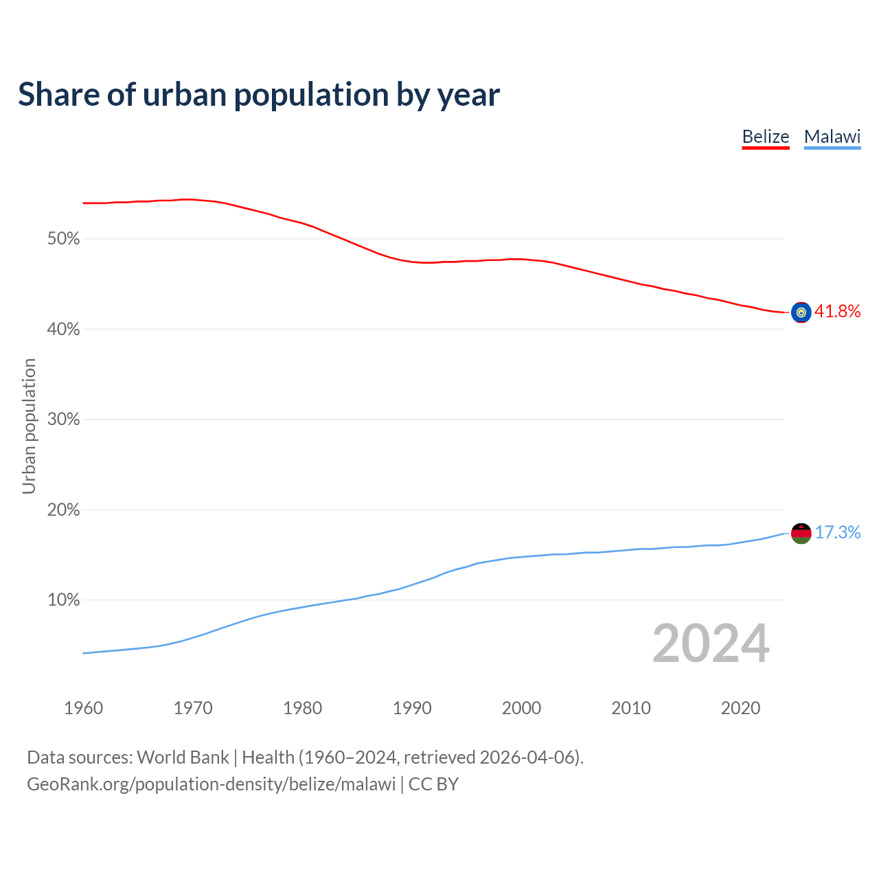 From 2004 to 2024, the share of urban population changed from 47% to 41.8% in Belize and from 15% to 17.3% in Malawi.