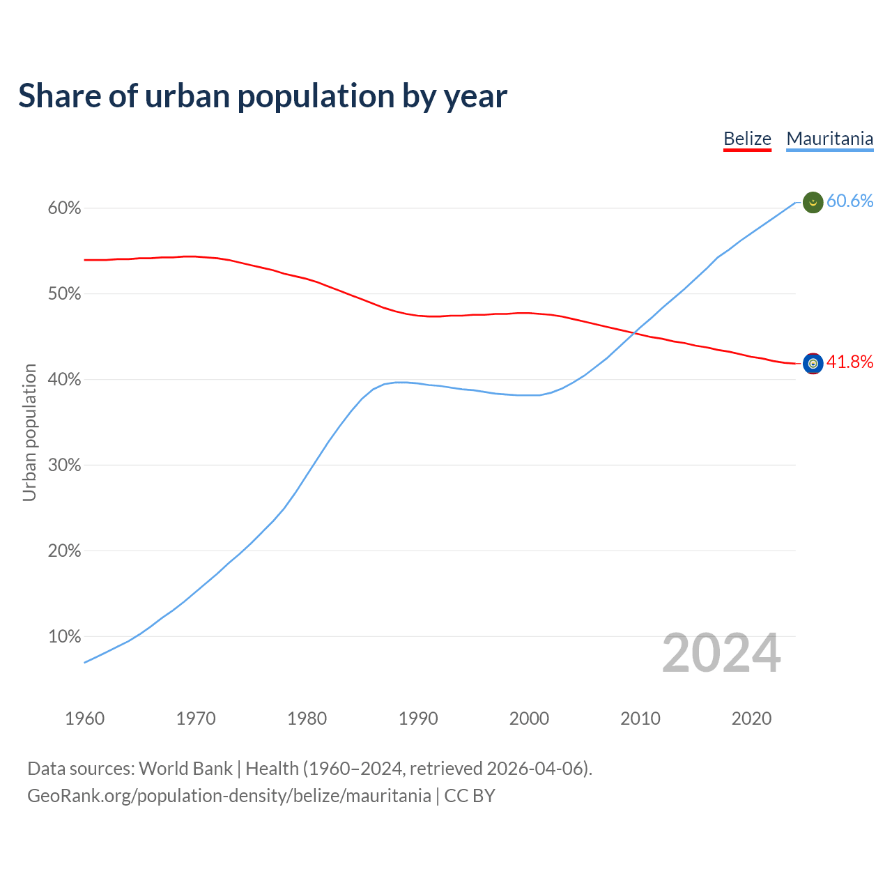 From 2004 to 2024, the share of urban population changed from 47% to 41.8% in Belize and from 39.6% to 60.6% in Mauritania.