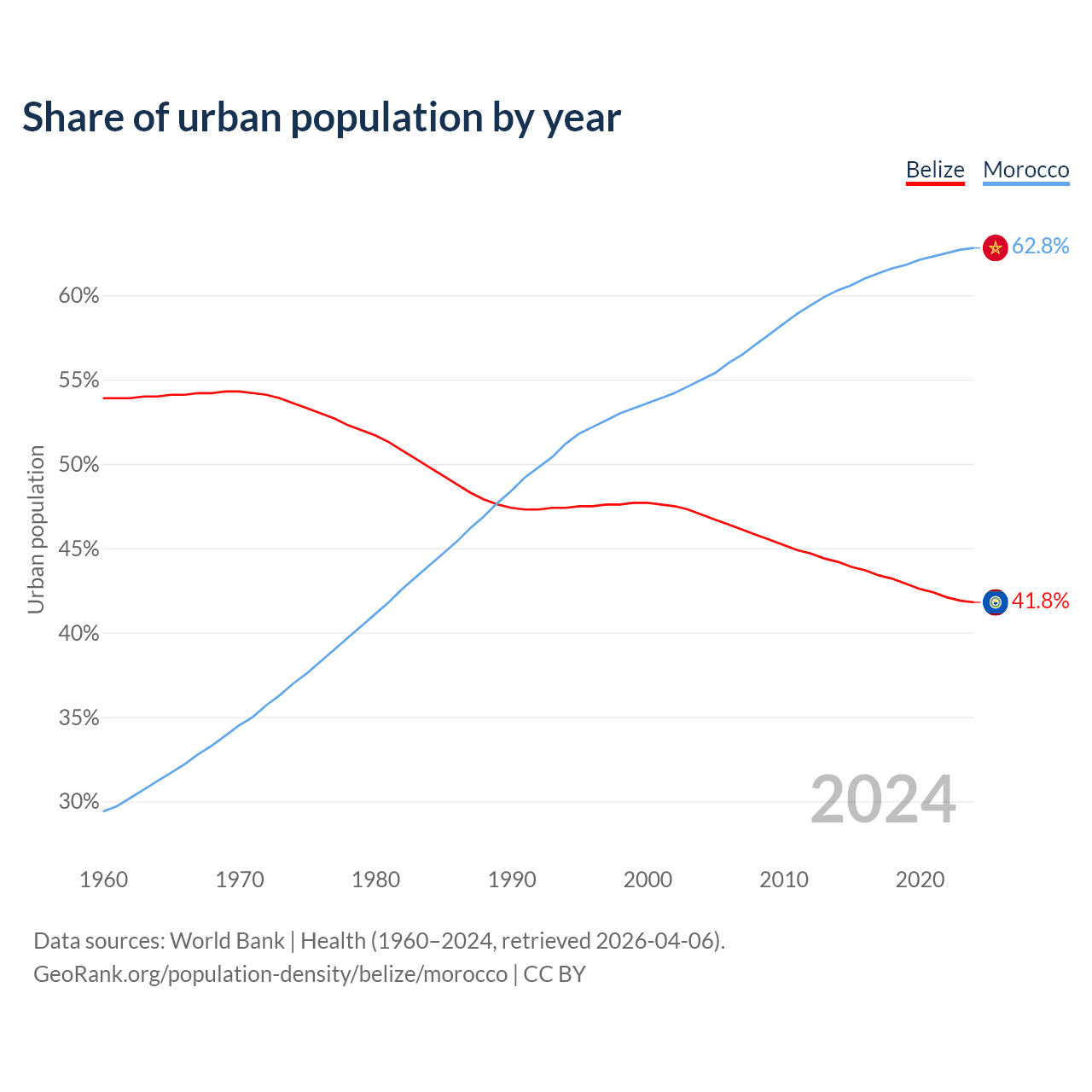 From 2004 to 2024, the share of urban population changed from 47% to 41.8% in Belize and from 55% to 62.8% in Morocco.