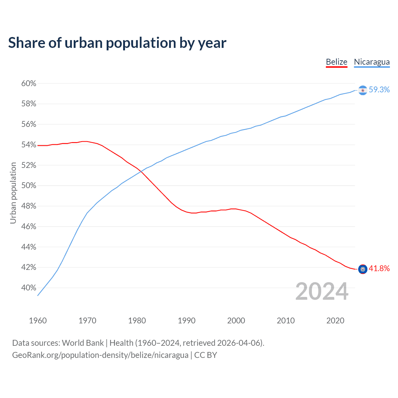 From 2004 to 2024, the share of urban population changed from 47% to 41.8% in Belize and from 55.8% to 59.3% in Nicaragua.