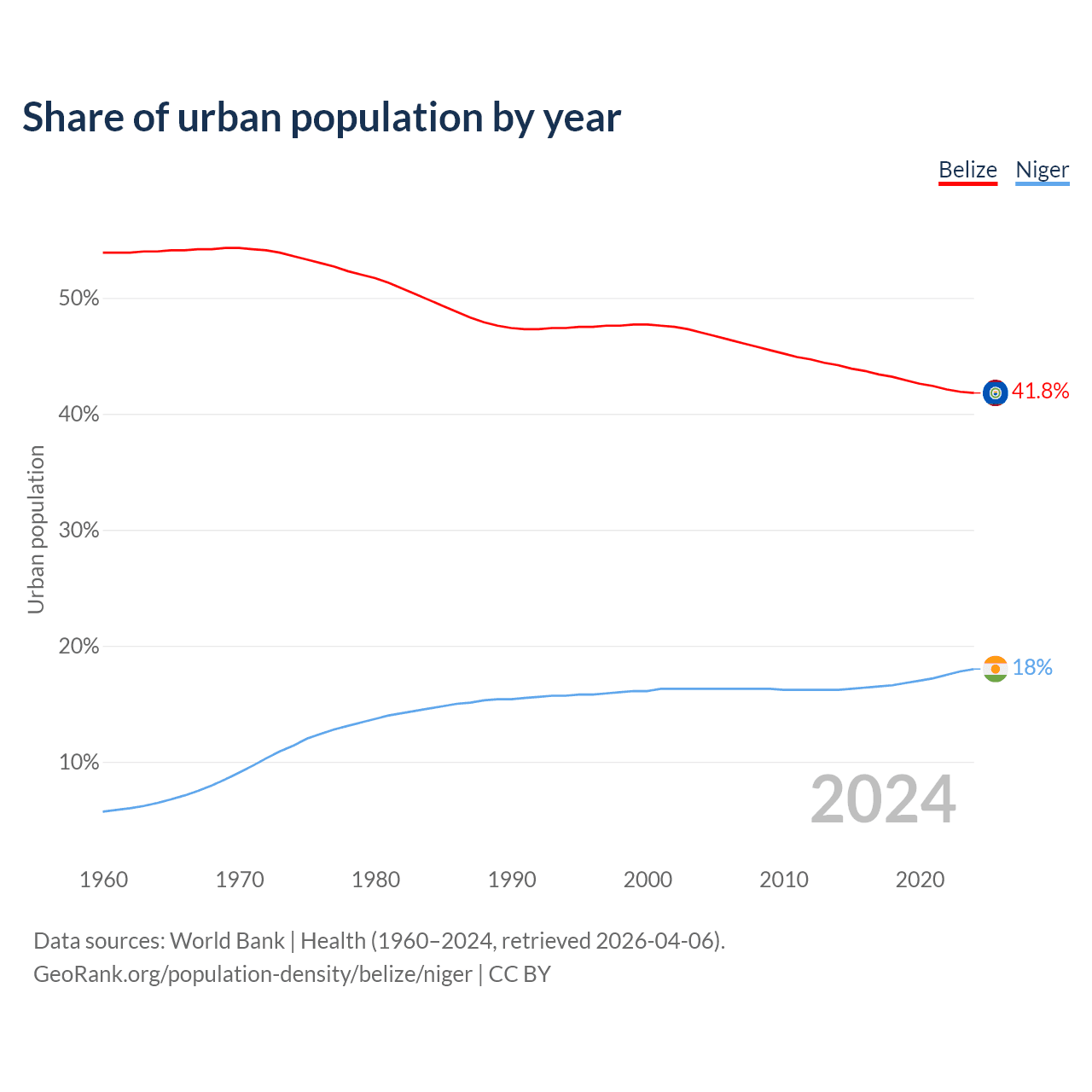 From 2004 to 2024, the share of urban population changed from 47% to 41.8% in Belize and from 16.3% to 18% in Niger.