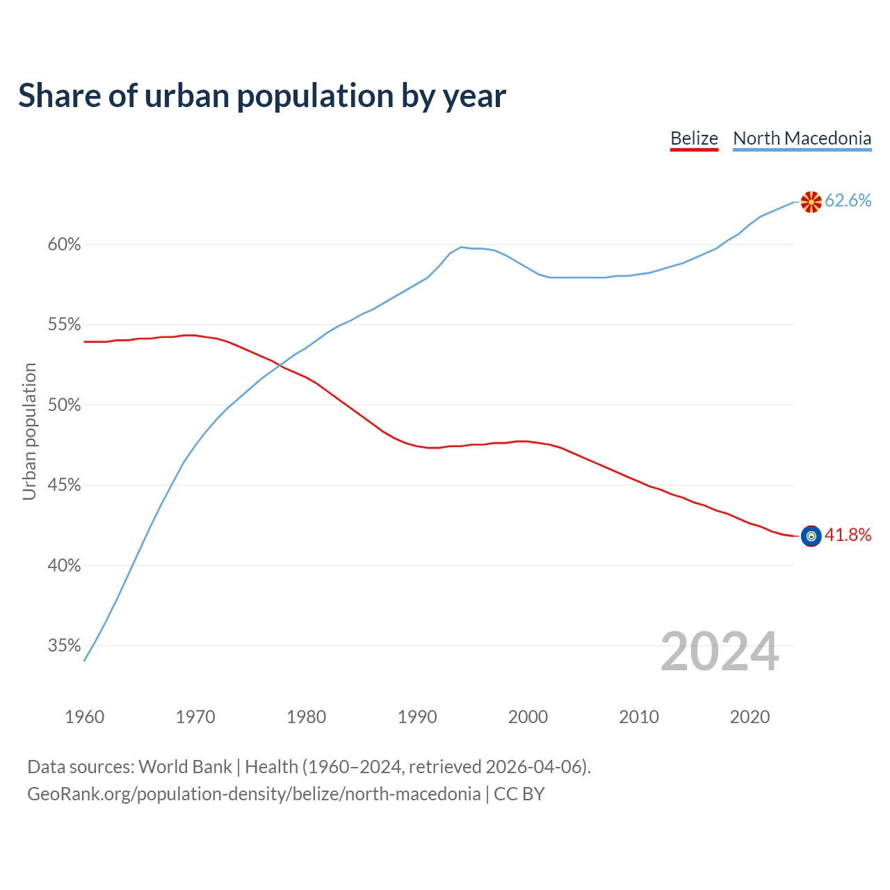From 2004 to 2024, the share of urban population changed from 47% to 41.8% in Belize and from 57.9% to 62.6% in North Macedonia.