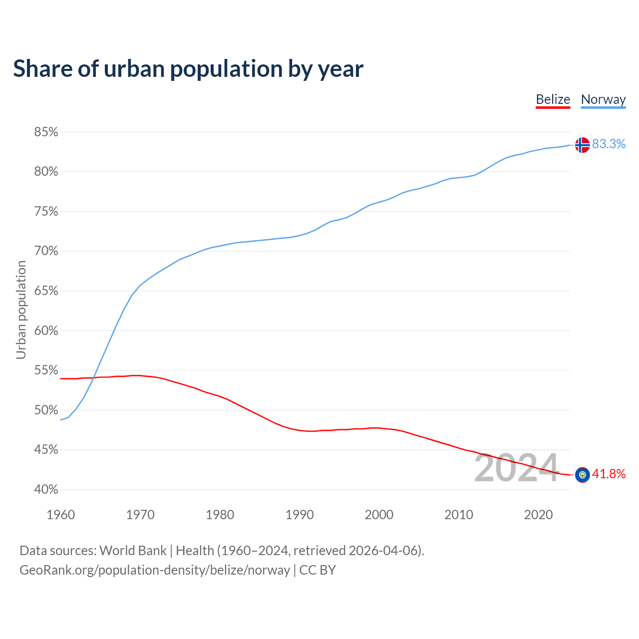 From 2004 to 2024, the share of urban population changed from 47% to 41.8% in Belize and from 77.6% to 83.3% in Norway.