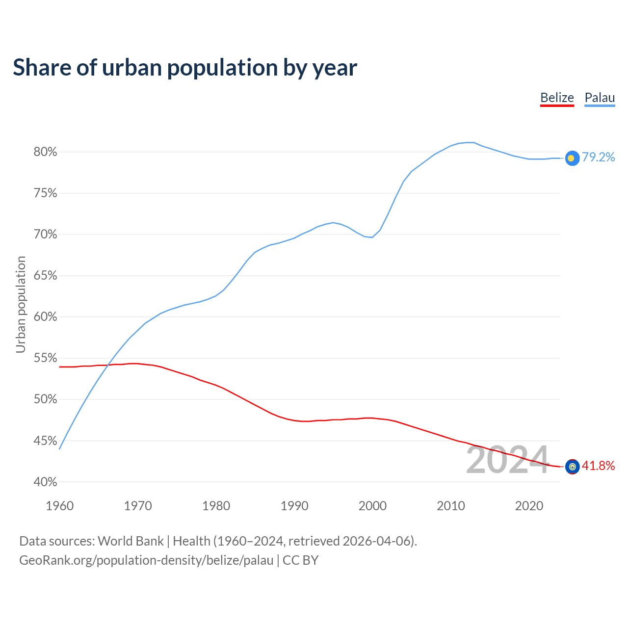 From 2004 to 2024, the share of urban population changed from 47% to 41.8% in Belize and from 76.4% to 79.2% in Palau.