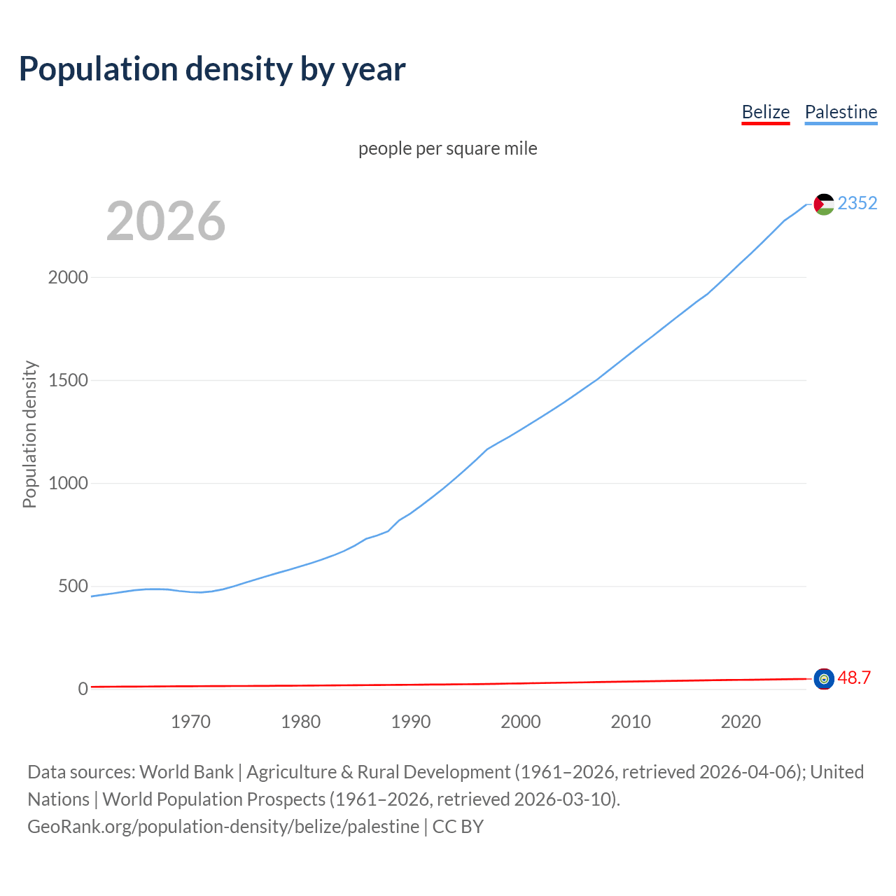 From 2006 to 2026, population density in Belize increased by 49%, compared to a 60.5% growth in Palestine.