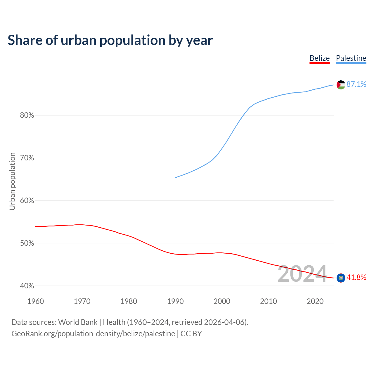 From 2004 to 2024, the share of urban population changed from 47% to 41.8% in Belize and from 79% to 87.1% in Palestine.