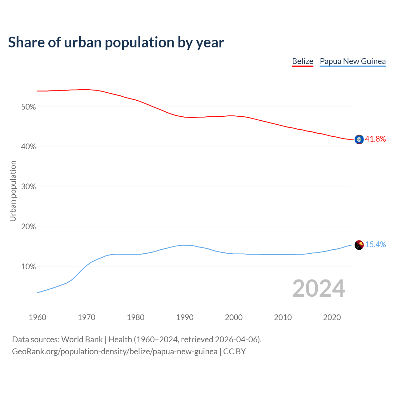 From 2004 to 2024, the share of urban population changed from 47% to 41.8% in Belize and from 13.1% to 15.4% in Papua New Guinea.