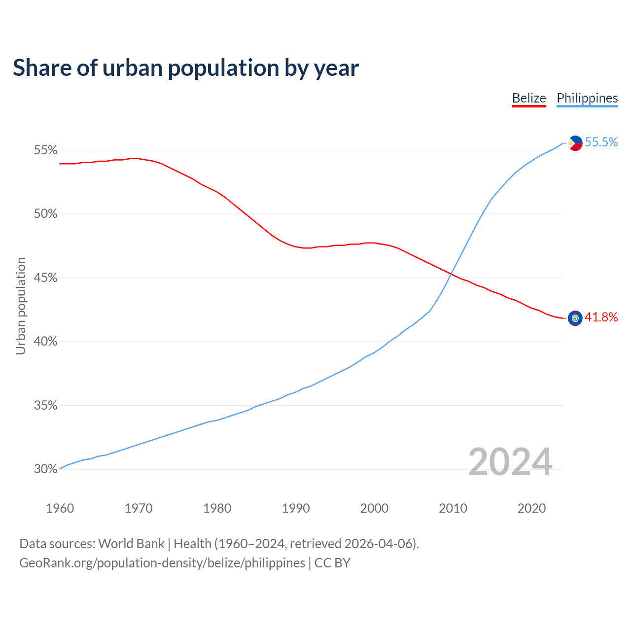 From 2004 to 2024, the share of urban population changed from 47% to 41.8% in Belize and from 40.9% to 55.5% in the Philippines.