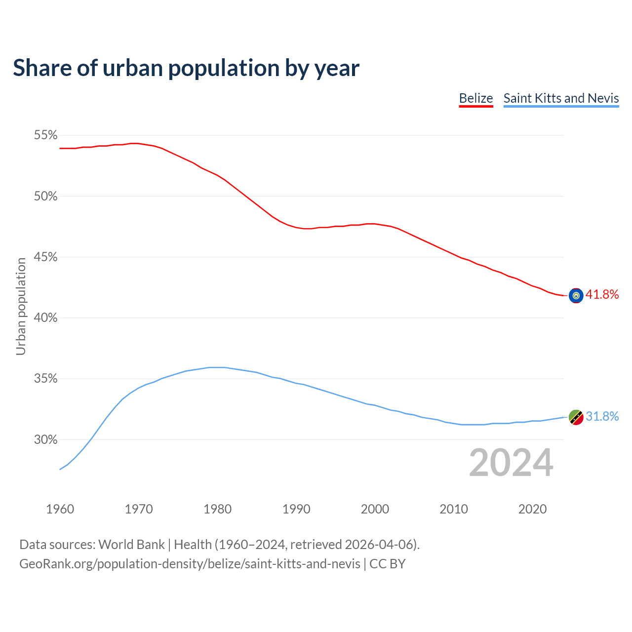 From 2004 to 2024, the share of urban population changed from 47% to 41.8% in Belize and from 32.1% to 31.8% in Saint Kitts and Nevis.