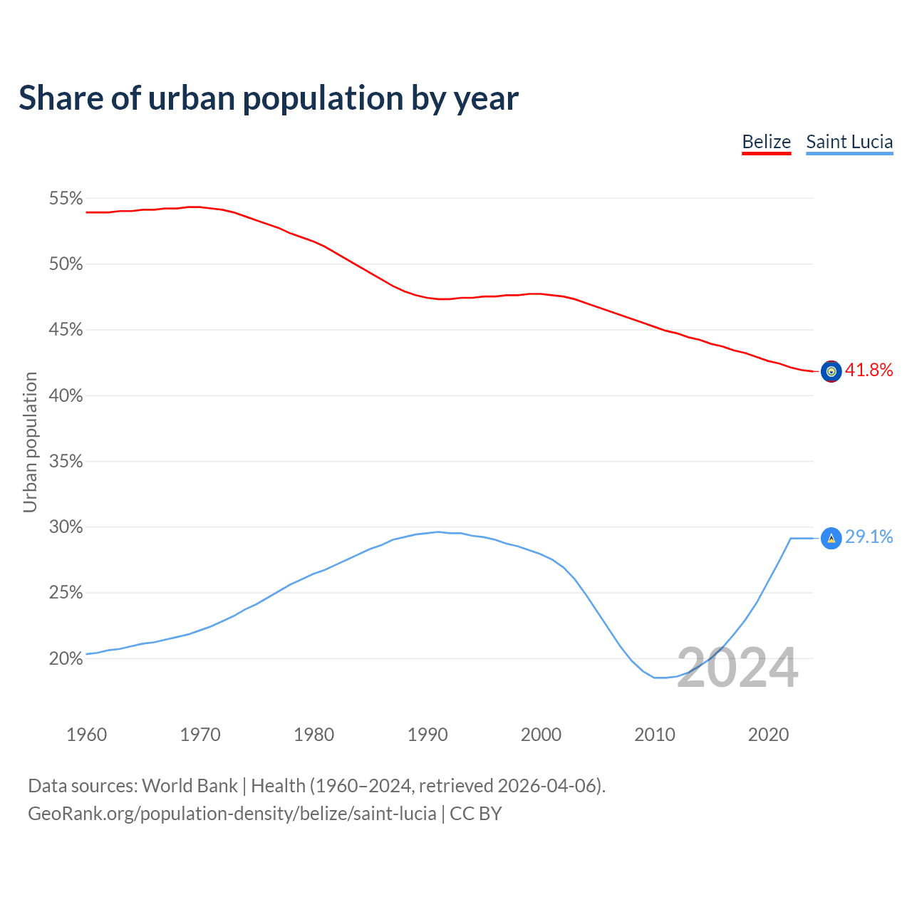 From 2004 to 2024, the share of urban population changed from 47% to 41.8% in Belize and from 24.8% to 29.1% in Saint Lucia.