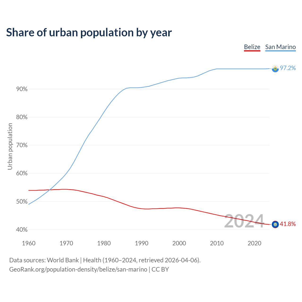 From 2004 to 2024, the share of urban population changed from 47% to 41.8% in Belize and from 94.2% to 97.2% in San Marino.