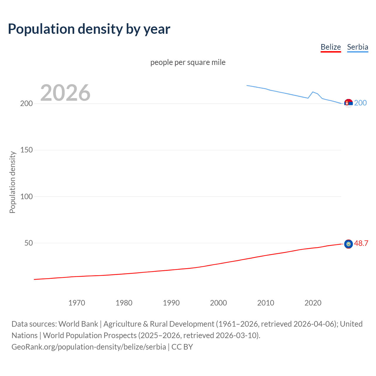 From 2006 to 2026, population density in Belize increased by 49%, compared to a 8.86% decline in Serbia.