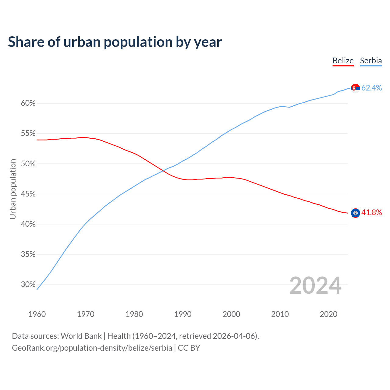 From 2004 to 2024, the share of urban population changed from 47% to 41.8% in Belize and from 57.3% to 62.4% in Serbia.