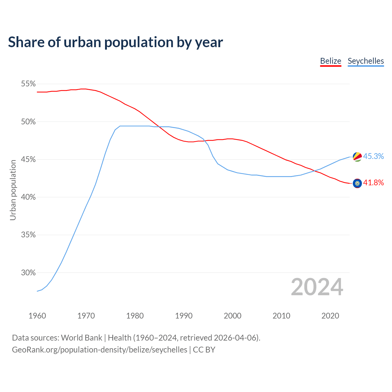 From 2004 to 2024, the share of urban population changed from 47% to 41.8% in Belize and from 42.9% to 45.3% in the Seychelles.