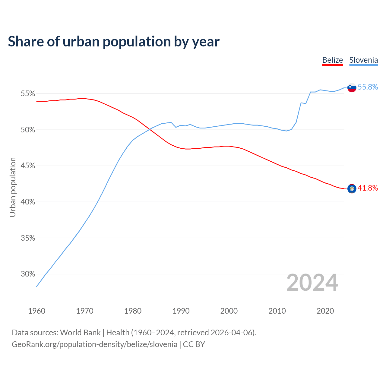 From 2004 to 2024, the share of urban population changed from 47% to 41.8% in Belize and from 50.7% to 55.8% in Slovenia.