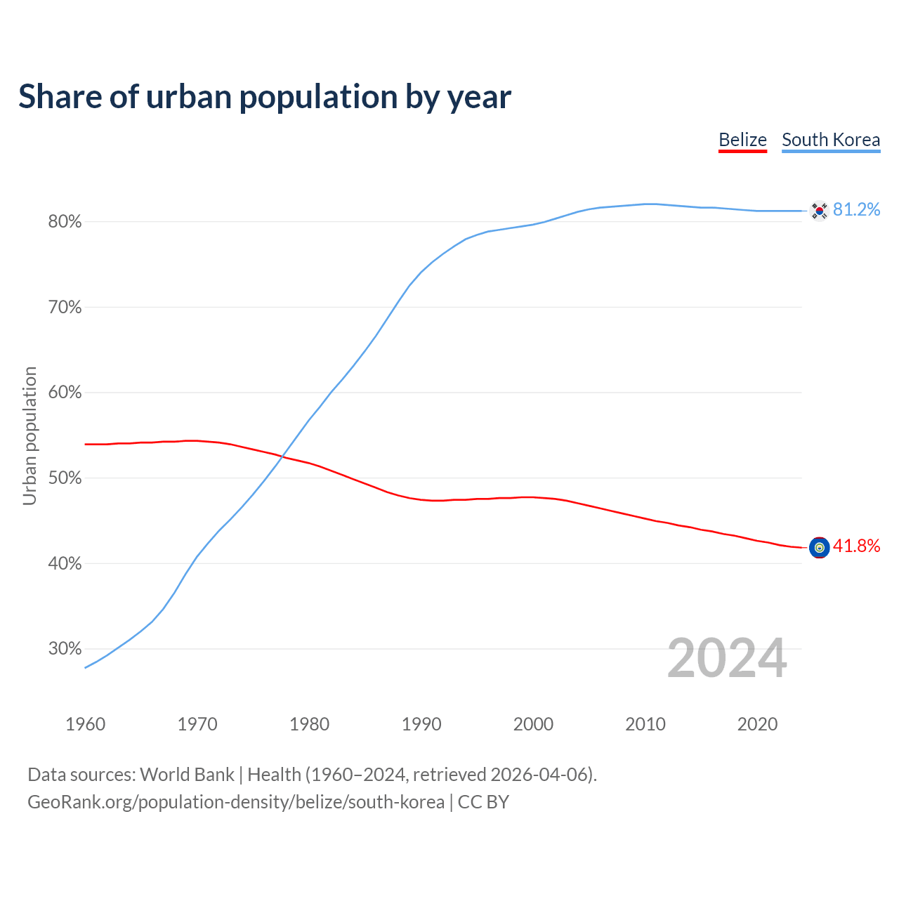From 2004 to 2024, the share of urban population changed from 47% to 41.8% in Belize and from 81.1% to 81.2% in South Korea.