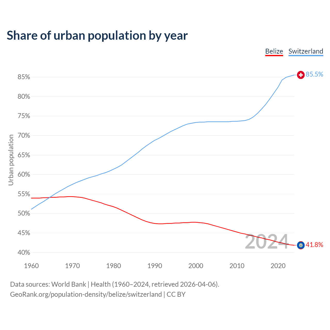 From 2004 to 2024, the share of urban population changed from 47% to 41.8% in Belize and from 73.5% to 85.5% in Switzerland.