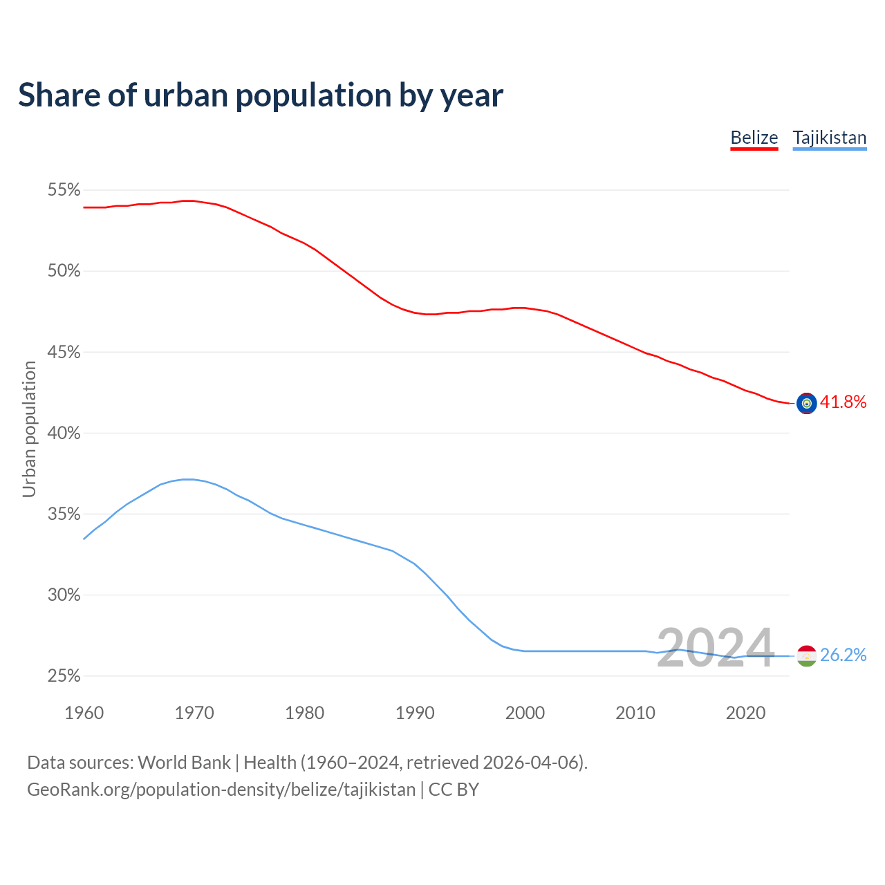 From 2004 to 2024, the share of urban population changed from 47% to 41.8% in Belize and from 26.5% to 26.2% in Tajikistan.