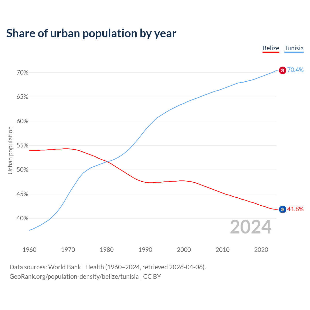 From 2004 to 2024, the share of urban population changed from 47% to 41.8% in Belize and from 64.9% to 70.4% in Tunisia.
