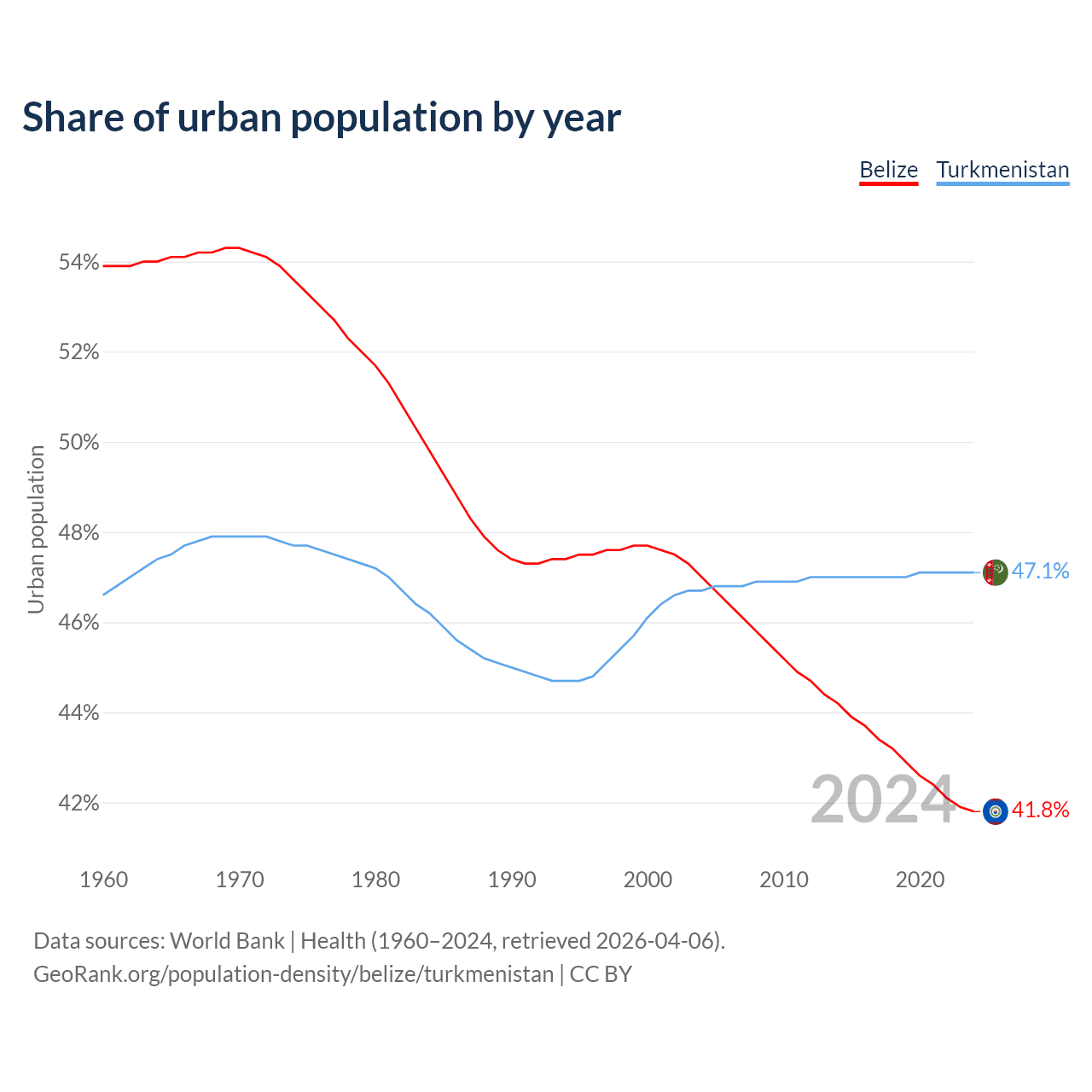 From 2004 to 2024, the share of urban population changed from 47% to 41.8% in Belize and from 46.7% to 47.1% in Turkmenistan.