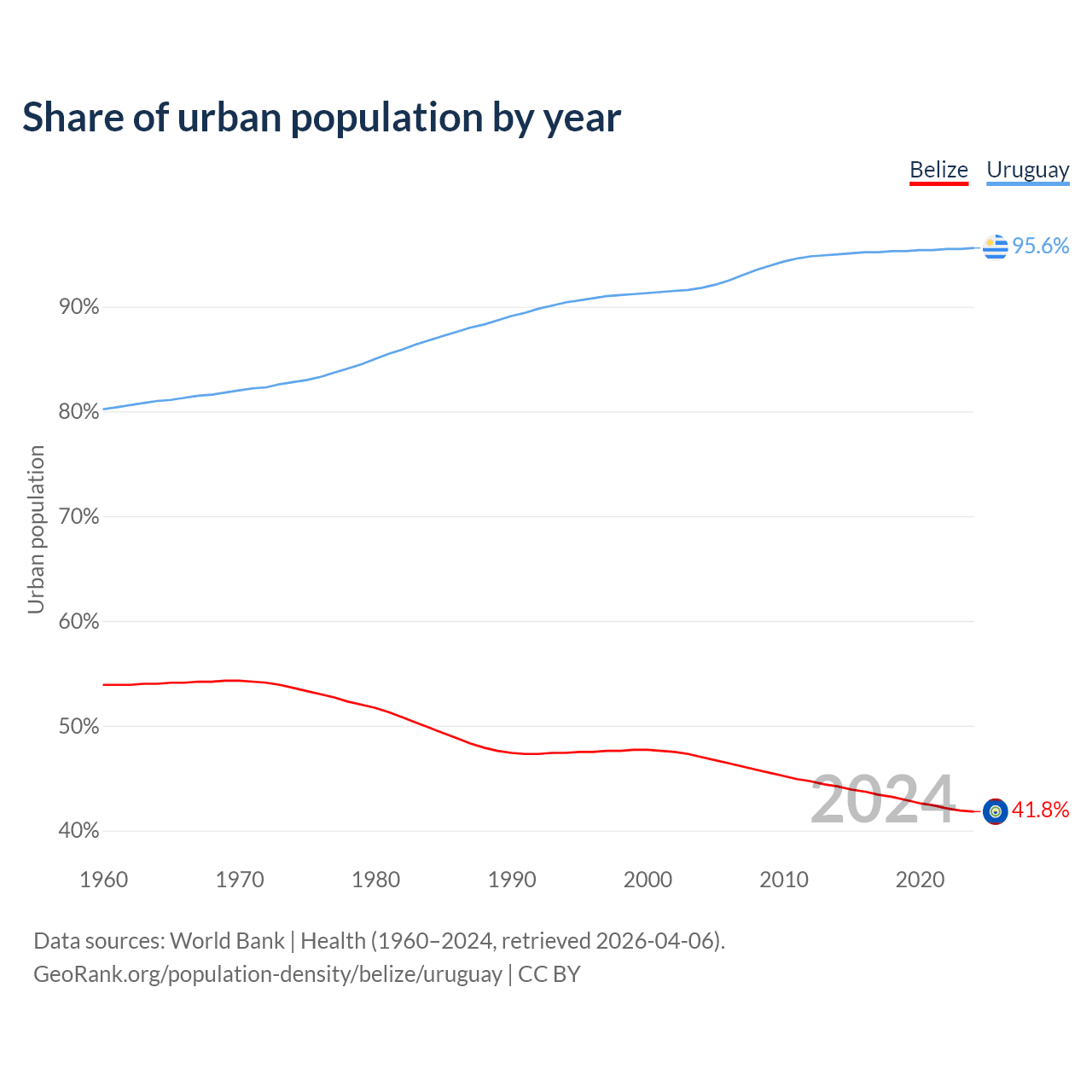 From 2004 to 2024, the share of urban population changed from 47% to 41.8% in Belize and from 91.8% to 95.6% in Uruguay.