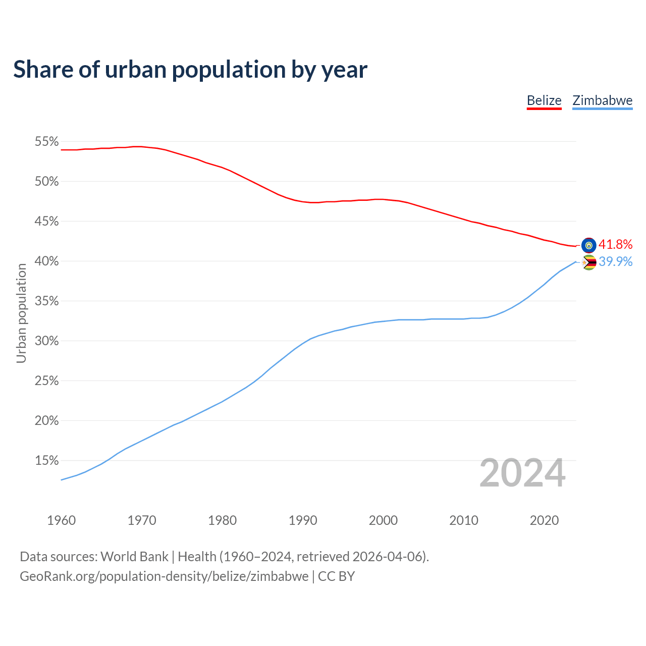 From 2004 to 2024, the share of urban population changed from 47% to 41.8% in Belize and from 32.6% to 39.9% in Zimbabwe.