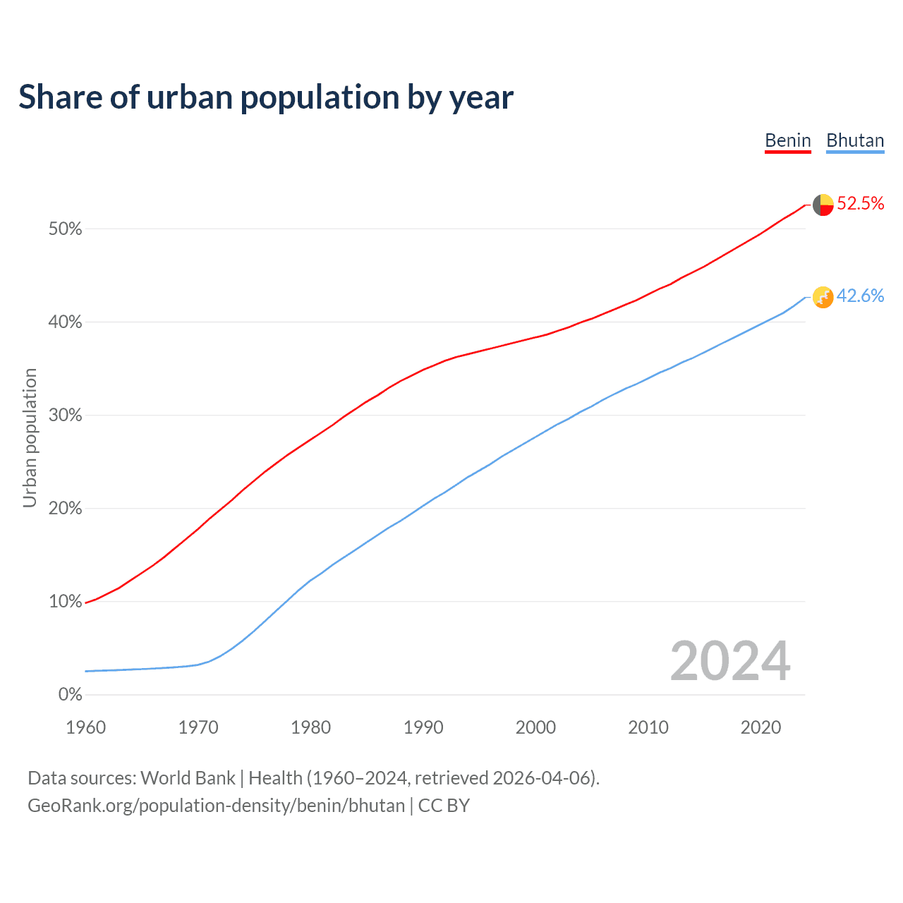 From 2004 to 2024, the share of urban population changed from 39.9% to 52.5% in Benin and from 30.3% to 42.6% in Bhutan.