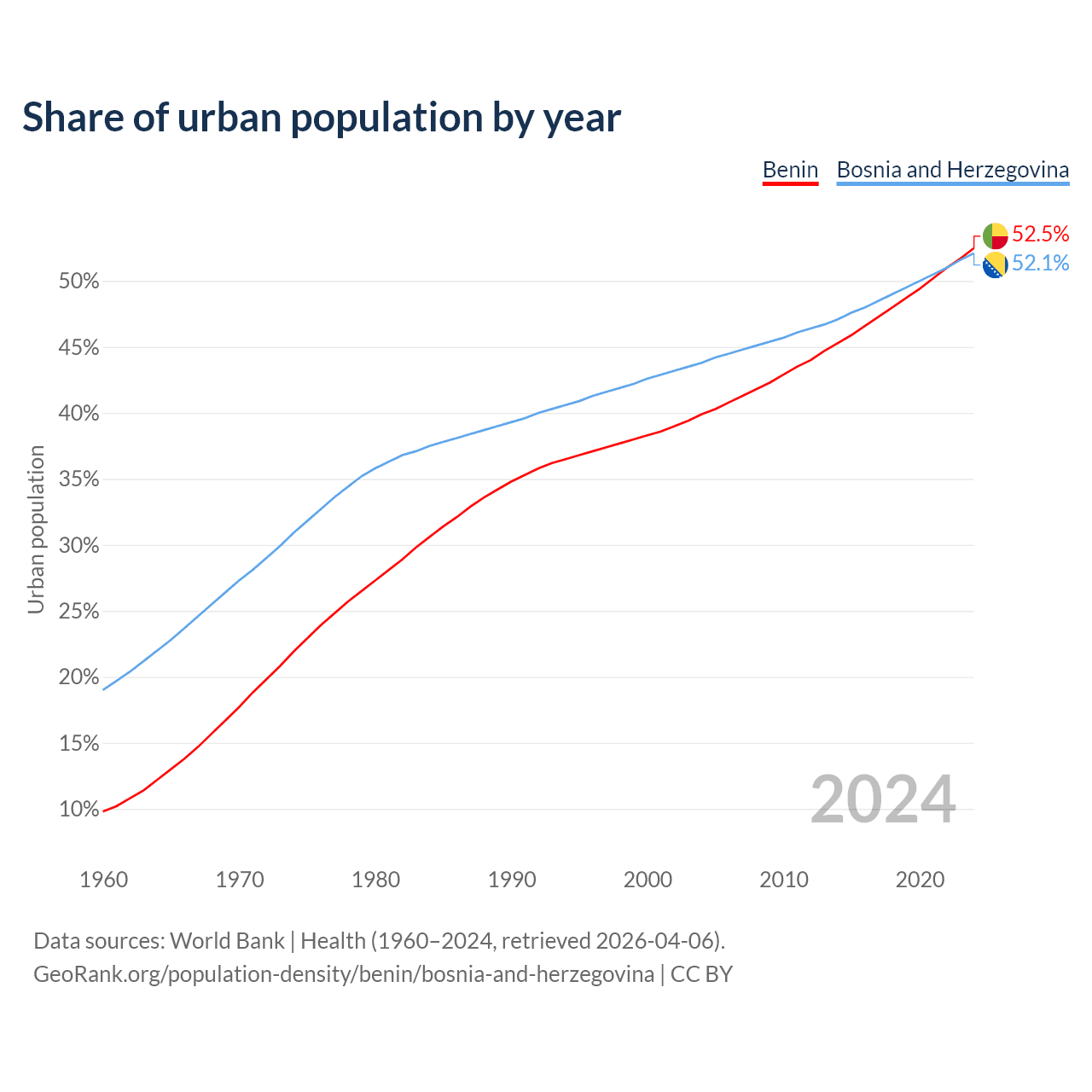 From 2004 to 2024, the share of urban population changed from 39.9% to 52.5% in Benin and from 43.8% to 52.1% in Bosnia and Herzegovina.