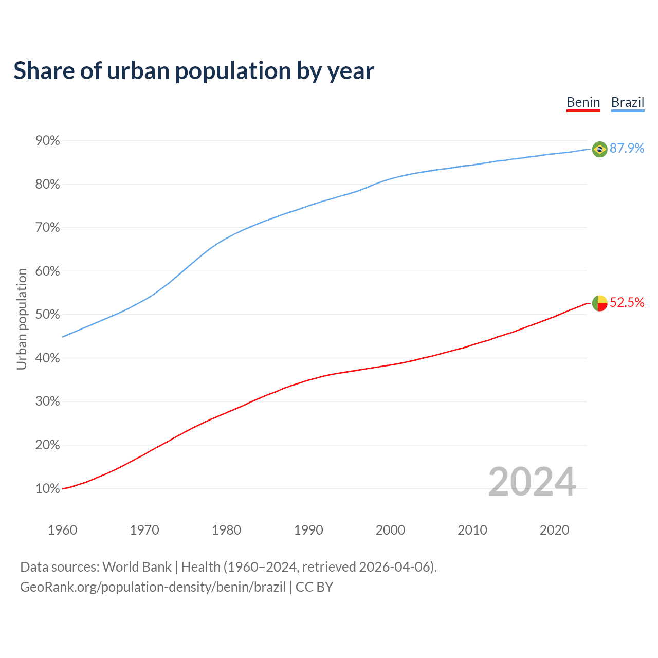 From 2006 to 2026, population density in Benin increased by 74.6%, compared to a 14.5% growth in Brazil.