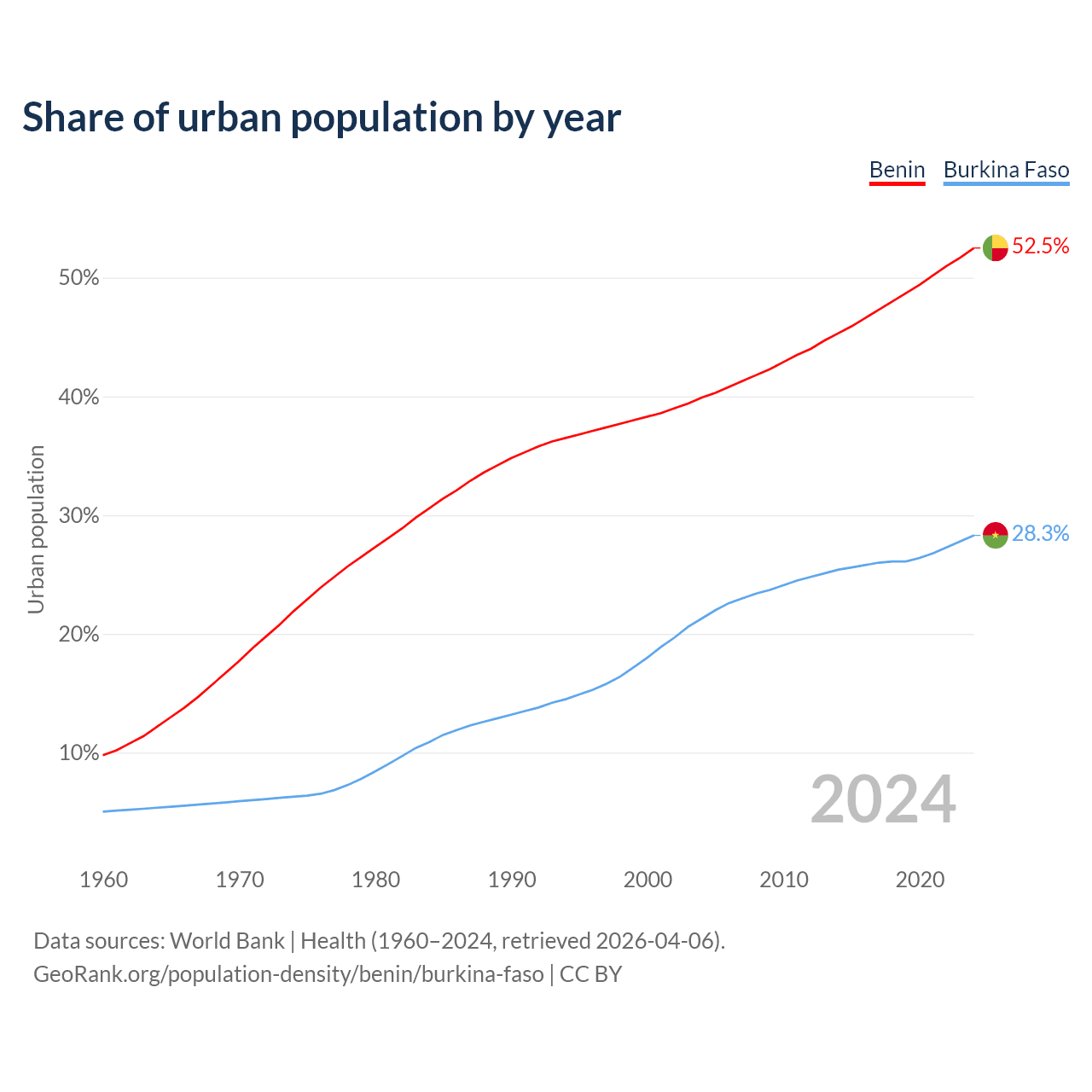 From 2004 to 2024, the share of urban population changed from 39.9% to 52.5% in Benin and from 21.3% to 28.3% in Burkina Faso.