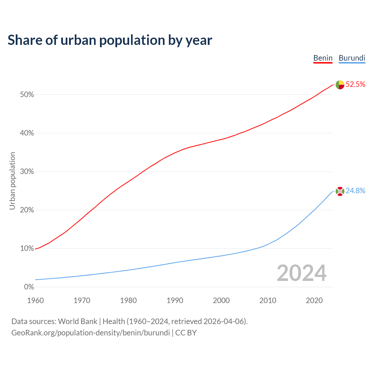 From 2004 to 2024, the share of urban population changed from 39.9% to 52.5% in Benin and from 8.92% to 24.8% in Burundi.