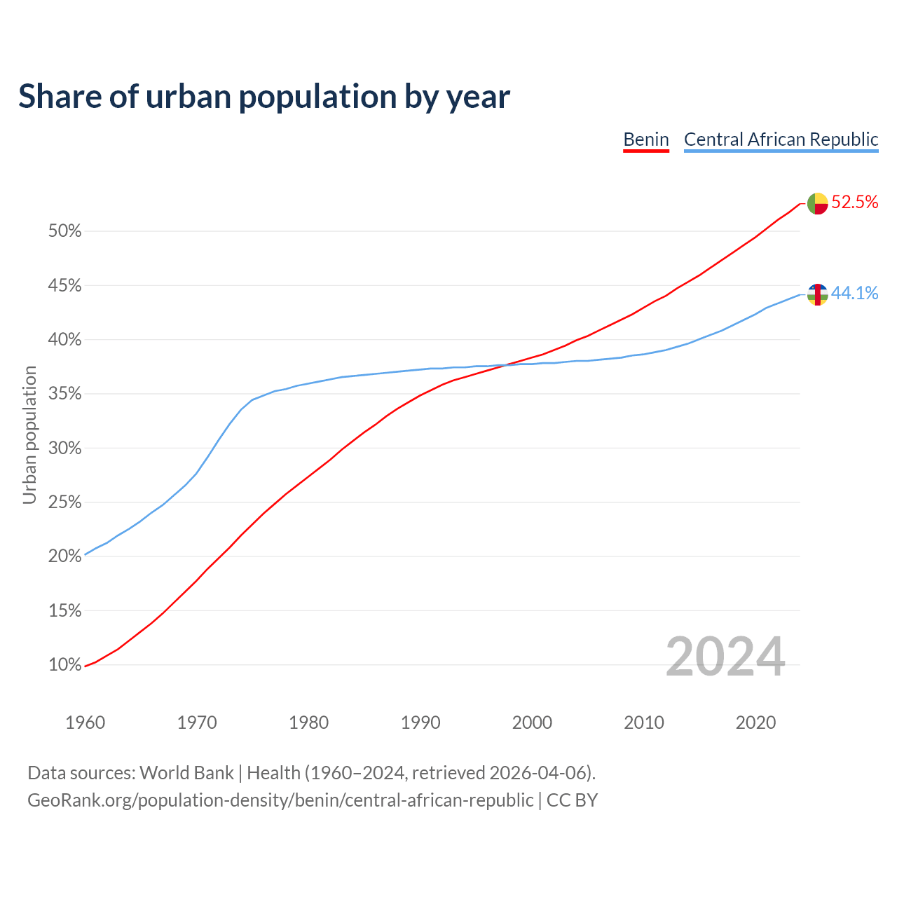 From 2004 to 2024, the share of urban population changed from 39.9% to 52.5% in Benin and from 38% to 44.1% in the Central African Republic.