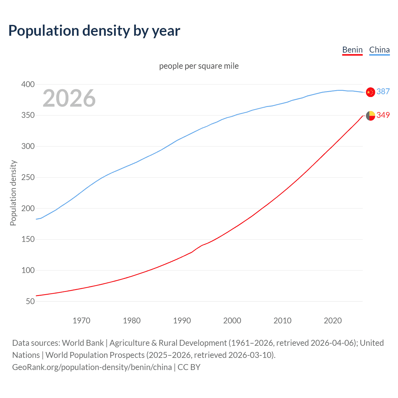 From 2006 to 2026, population density in Benin increased by 74.6%, compared to a 6.98% growth in China.