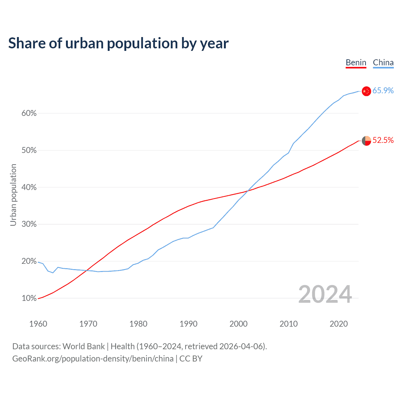 From 2004 to 2024, the share of urban population changed from 39.9% to 52.5% in Benin and from 41.8% to 65.9% in China.
