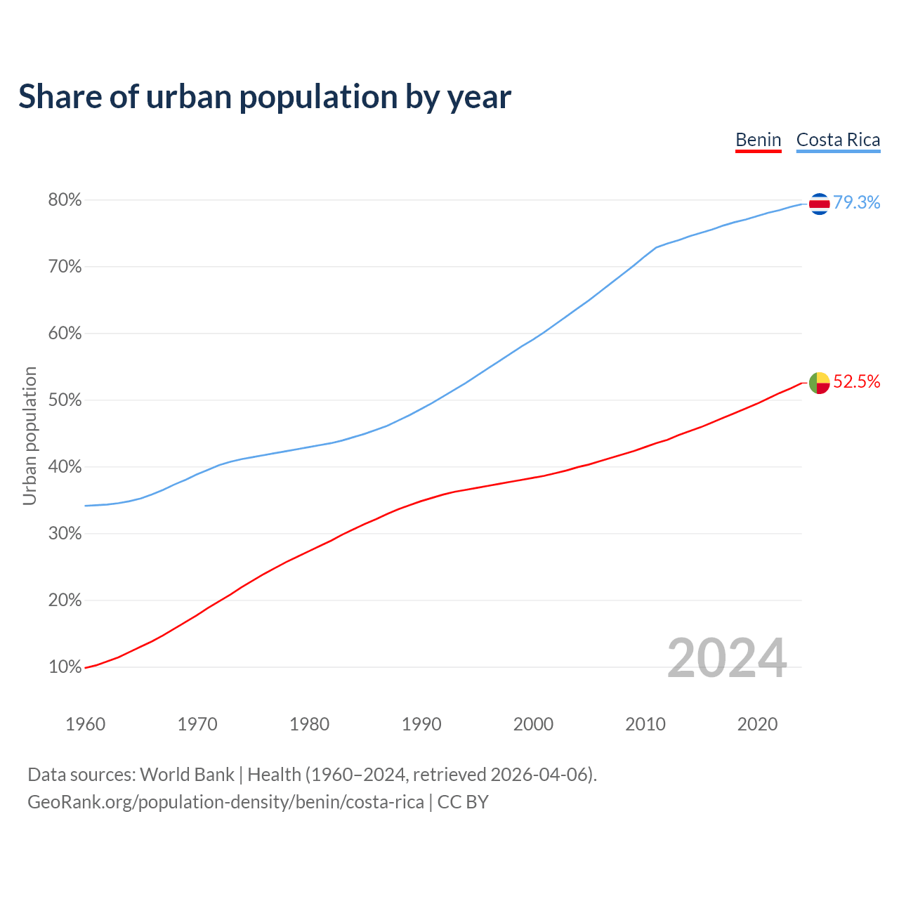 From 2004 to 2024, the share of urban population changed from 39.9% to 52.5% in Benin and from 63.7% to 79.3% in Costa Rica.