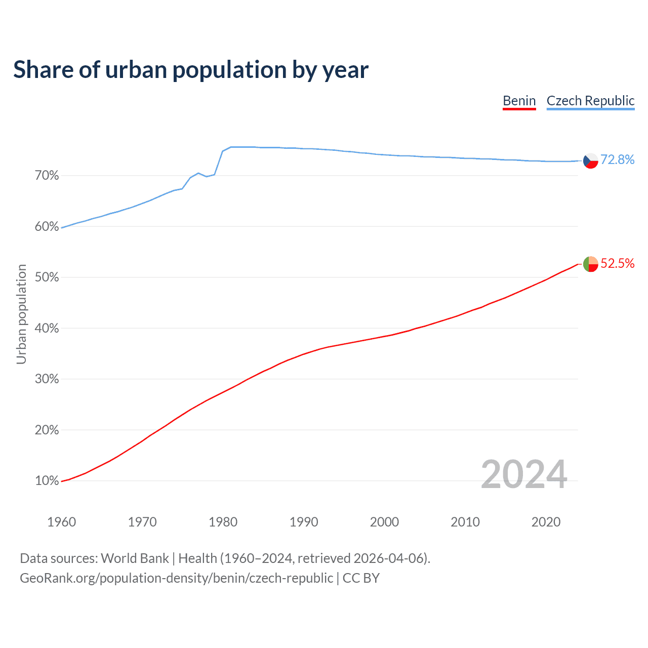 From 2004 to 2024, the share of urban population changed from 39.9% to 52.5% in Benin and from 73.7% to 72.8% in the Czech Republic.