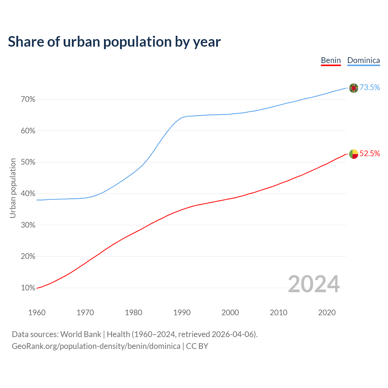 From 2004 to 2024, the share of urban population changed from 39.9% to 52.5% in Benin and from 66% to 73.5% in Dominica.