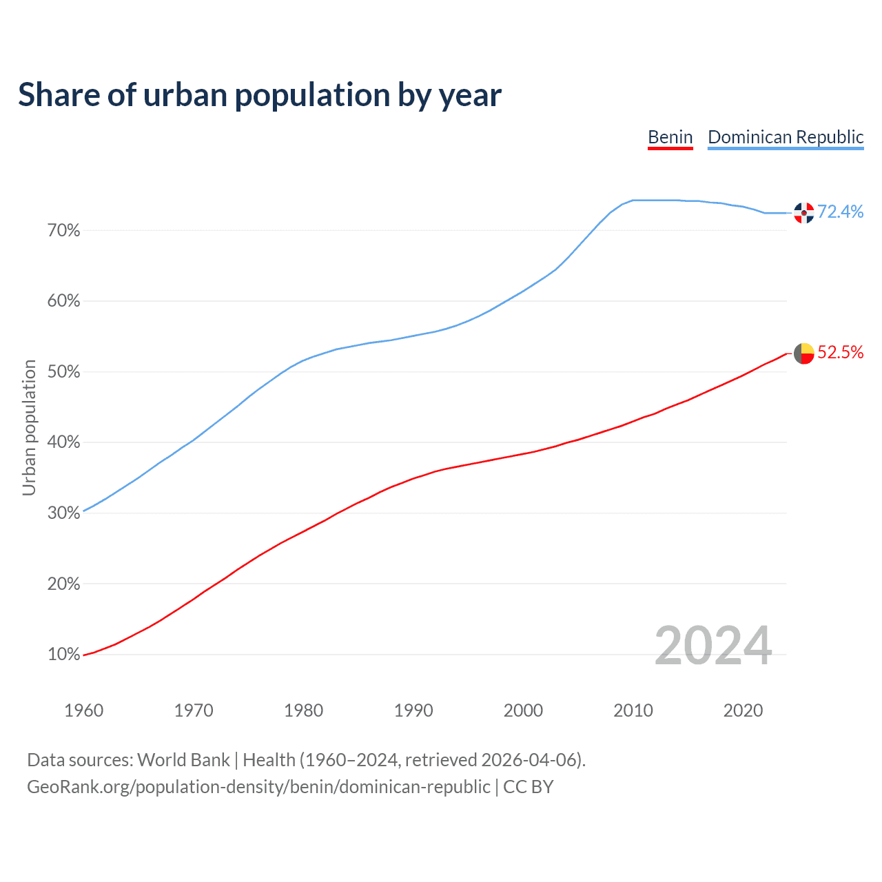From 2004 to 2024, the share of urban population changed from 39.9% to 52.5% in Benin and from 65.9% to 72.4% in the Dominican Republic.