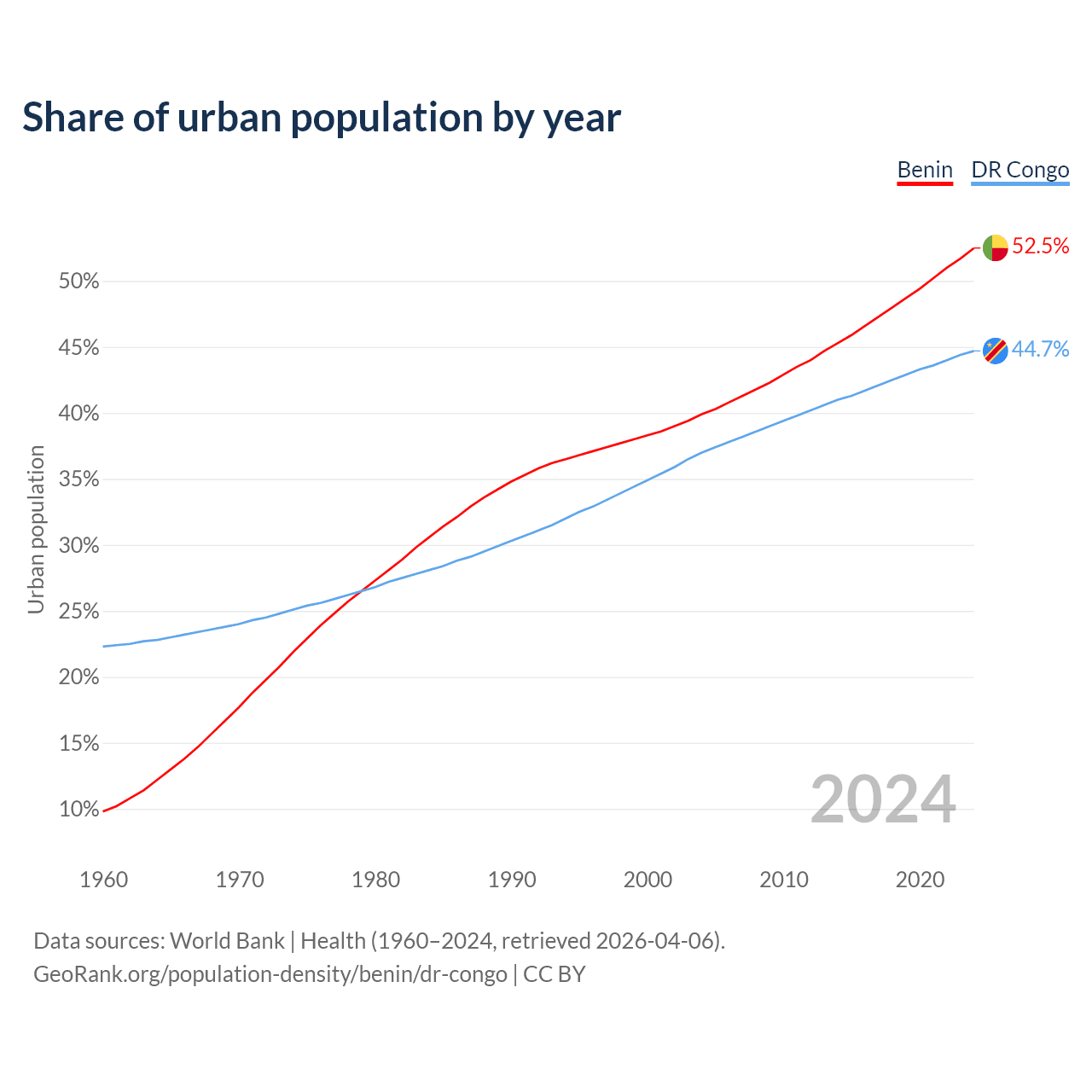 From 2004 to 2024, the share of urban population changed from 39.9% to 52.5% in Benin and from 37% to 44.7% in the DR Congo.