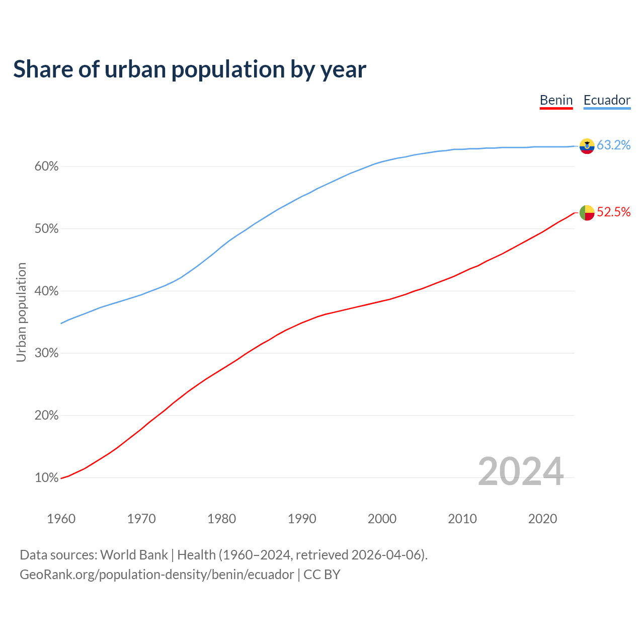 From 2004 to 2024, the share of urban population changed from 39.9% to 52.5% in Benin and from 61.8% to 63.2% in Ecuador.